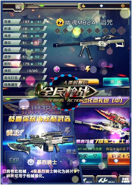 全民槍戰》新版本中加入了增強版槍械強化改裝玩法,收集槍械碎片合成特定槍械,騎士系列、生化系列等20余種槍械皆可合成,為你的軍火庫添磚加瓦,輕松應對不同的...